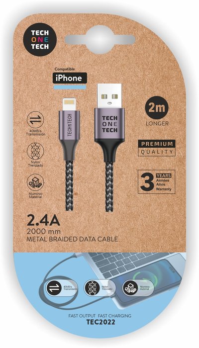 CABLE NYLON GRIS 2 METROS (USB-A A LIGHTNING/APPLE) 2,4A