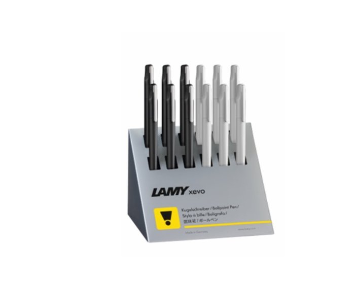 EXPOSITOR 12 BOLIGRAFOS LAMY XEVO W652 NEGRO Y PLATA