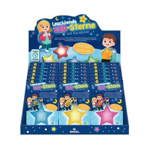 EXPOSITOR 18 LLAVEROS ESTRELLA LED CON MOSQUETON SURTIDAS