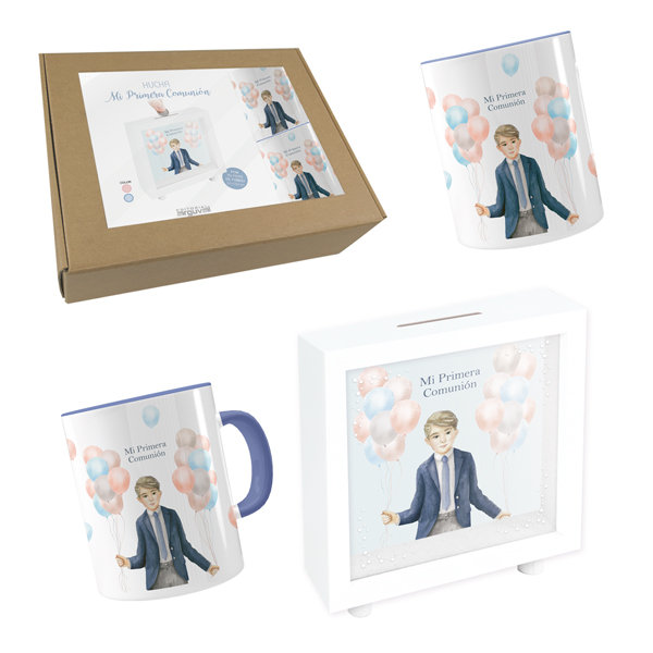 SET COMUNION NI?O GLOBOS (HUCHA-TAZA-CUBILETE)