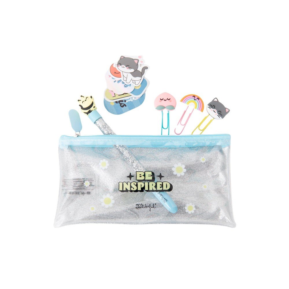 SET DE ESTUCHE + BOLIGRAFO+ CLIPS + PEGATINAS GLITTER