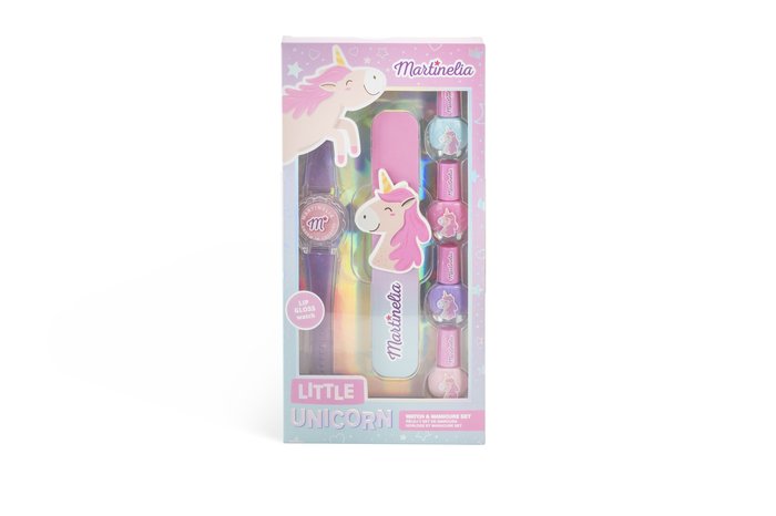 SET DE RELOJ UNICORNIO CON BRILLO Y MANICURA MARTINELIA