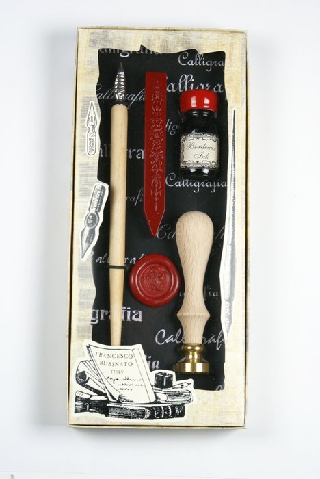 SET PLUMA MADERA Y LACRE SELLO PERGAMINO 4 PIEZAS