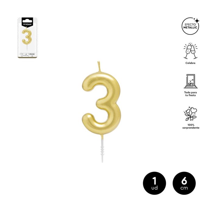 VELA CERA NUMERO 3 ORO 6 CM